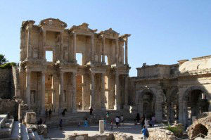The ruins of Ephesus : are a very popular tourist attraction on the west coast of the country. The city of Ephesus was once known for its Temple of Artemis, one of the Seven Wonders of the Ancient World, destroyed by a raging mob in 401 AD under the orders of the Archbishop of Constantinople. Some structures are still visible, including the great theater and the bookstore of Celsius. The bookstore was built around 125 BC to store 12,000 scrolls and serve as a tomb for Celsius, the Roman governor of Asia. The facade was rebuilt in 1970 so that the site can recover some of its former splendor.